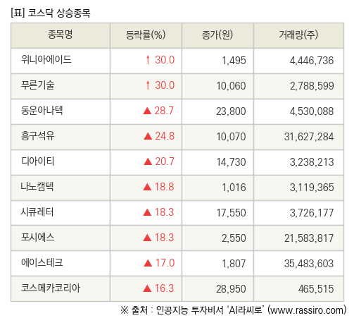 [fnRASSI]장마감, 코스닥 상승 종목(위니아에이드 30.0% ↑)