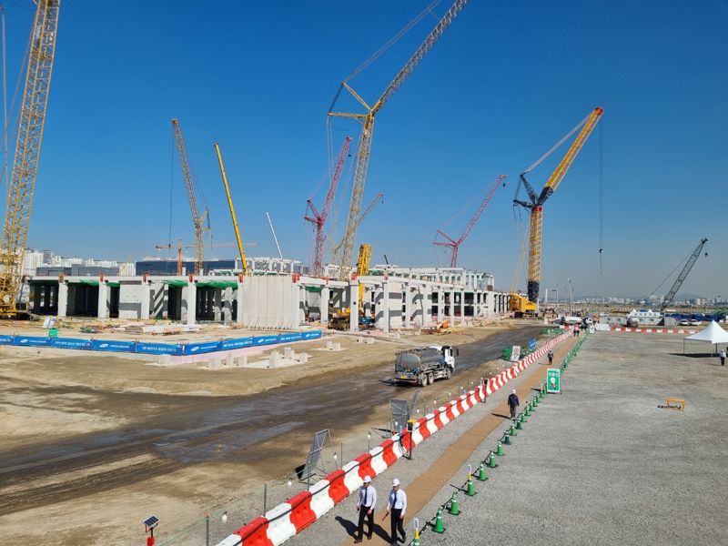 5공장 현장은 많은 인부들이 건축물에 달라붙어 인력을 투입하는 일반적인 건설현장과는 다른 모습을 보였다. 공기를 단축하고 공사효율을 극대화하기 위해 현장에서 콘크리트를 타설·양생하는 전통적인 방식이 아닌 제작된 모듈을 조립하는 '프리캐스트 콘크리트' 공법으로 짓는다. 때문에 현장에서는 거대한 타워크레인을 중심으로 공사가 진행됐다.