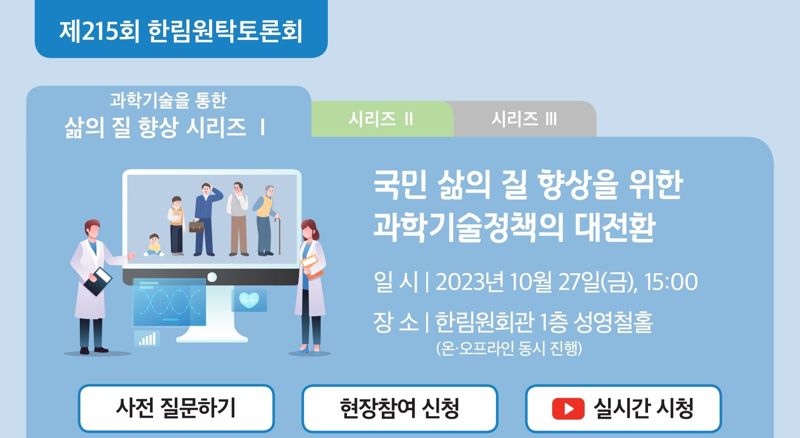 한국과학기술한림원은 오는 27일 '국민 삶의 질 향상을 위한 과학기술정책의 대전환'을 주제로 제215회 한림원탁토론회를 온·오프라인으로 동시 개최한다.