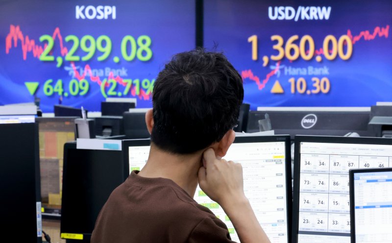 코스피 2.7% 급락 (서울=연합뉴스) 홍해인 기자 = 26일 오후 서울 중구 을지로 하나은행 본점 딜링룸 현황판에 코스피, 원/달러 환율 종가가 표시돼 있다. 이날 코스피는 64.09포인트(2.71%) 내린 2,299.08로 장이 종료됐다. 서울 외환시장에서 원/달러 환율은 10.3원 오른 달러당 1,360.0원으로 거래를 마쳤다. 2023.10.26 hihong@yna.co.kr (끝)