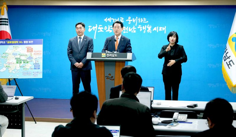 김영록 전남도지사(사진 가운데)가 13일 도청 브리핑룸에서 이병운 순천대 총장(왼쪽)과 함께 "국립 순천대의 글로컬대학 본지정을 적극 환영하며, 순천대를 지역 발전의 허브 역할을 하는 거점대학으로 집중 육성하겠다"라고 밝히고 있다. 전남도 제공