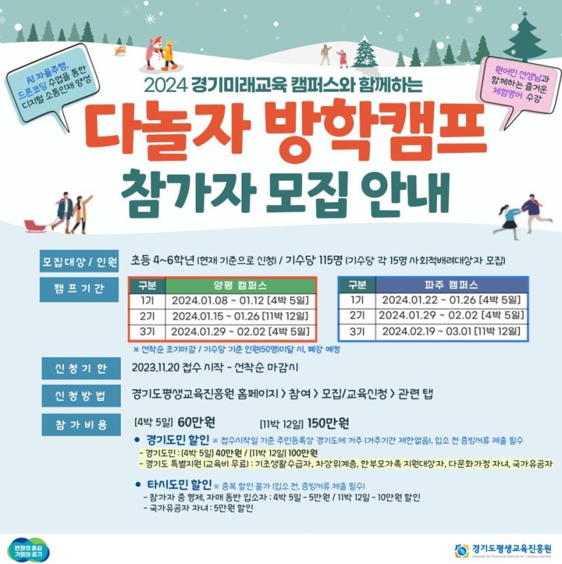 【파이낸셜뉴스 수원=장충식 기자】 경기도와 경기도평생교육진흥원은 내년 1월부터 운영되는 경기미래교육캠퍼스 겨울방학돌봄 프로그램인 '다놀자 방학캠프' 참가자를 오는 20일부터 모집한다고 16일 밝혔다.