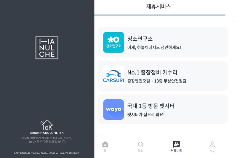 코오롱글로벌은 전용 홈 사물인터넷(IoT) 플랫폼인 ‘하늘채 IoK’를 중심으로 스마트 가전 연동 및 음성인식 기능, 주거통합서비스 등 멀티서비스플랫폼 기반의 고도화된 스마트홈 서비스를 지속적으로 확대해나갈 예정이다.