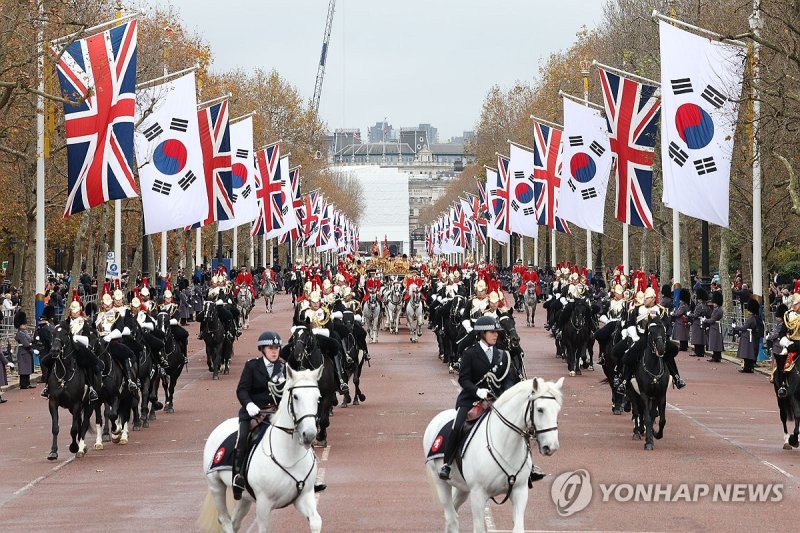 버킹엄궁 향하는 윤석열 대통령과 찰스 3세 영국 국왕 탑승 마차 (런던=연합뉴스) 진성철 기자 = 영국을 국빈 방문한 윤석열 대통령과 찰스 3세 영국 국왕이 탑승한 마차가 21일(현지시간) 런던 호스가즈 광장에서 열린 공식환영식이 끝난 뒤 버킹엄궁으로 향하고 있다. 2023.11.21 zjin@yna.co.kr (끝)