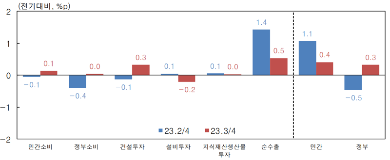 투자 부문에서는 건설투자가 0.3%p로 경제성장에 소폭 기여했고 설비투자와 지식재산생산물투자가 각각 -0.2%p, 0%p를 기록했다. 순수출의 경제성장률 기여도는 0.5%p로 전분기 대비 0.9%p 급감했다.