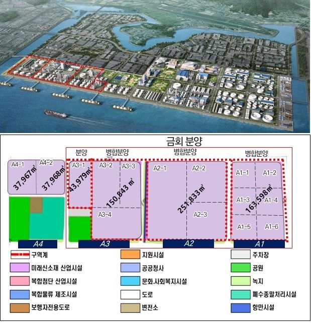 분양 대상은 미래신소재산업시설 부지 중 4개 획지(A1, A2, A3-1, A3-2·3·4)로, 총 분양면적은 61만㎡다. 입주가능 업종코드는 제조업(C19·20·21·23), 전기, 가스, 증기 및 공기 조절 공급업(D35), 운수 및 창고업(H52)만 가능하다.
