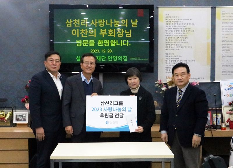 삼천리 이찬의 부회장(왼쪽 두번째)이 경기 안양에 위치한 안양의 집을 찾아 소외계층 아동·청소년을 위한 ‘사랑나눔의 날’ 후원금을 전달하고 있다. 삼천리 제공