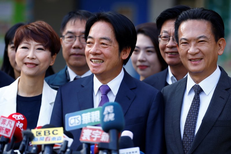 대만 총통에 당선된 라이칭더 민진당 후보가 13일 (현지시간) 타이난에서 투표를 마친 뒤 취재진을 만나고 있다. 로이터뉴스1