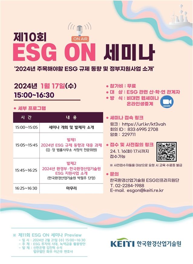 [파이낸셜뉴스]환경부 산하 한국환경산업기술원은 17일 비대면 온라인을 통해 '제10회 ESG(환경·사회·지배구조) ON 세미나'를 열고, ESG 규제 법제화에 따른 대응 방안을 모색한다고 16일 밝혔다.