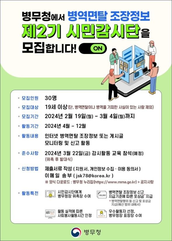 시민감시단에는 병역면탈 예방활동에 관심이 있는 만 19세 이상이 지원할 수 있다. 모집인원은 30명으로, 병무청 홈페이지에 게시된 지원서 등을 작성해 제출하면 된다.