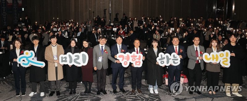 서울 종로구 JW메리어트동대문스퀘어호텔에서 열린 '2023 미래내일 일경험 콘퍼런스'에서 이정식 고용노동부 장관(오른쪽 여섯째)이 참석자들과 기념 퍼포먼스를하고 있다. <연합뉴스>