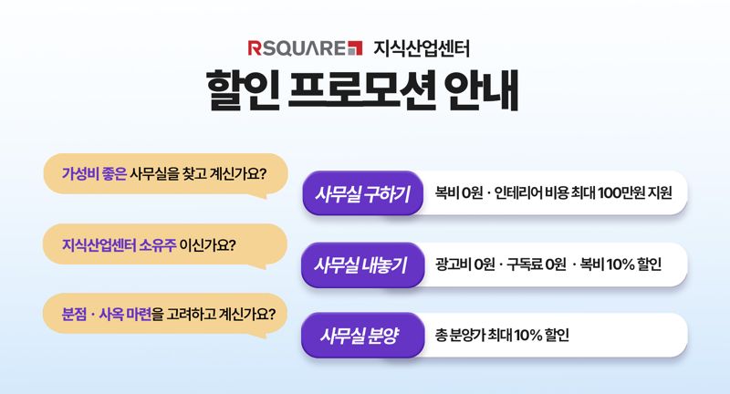알스퀘어는 "올해 금리 인하 기대감으로 지식산업센터 매매지수가 회복 중"이라며 "오랜만에 찾아온 '훈풍'에 지식산업센터 사무실을 구하는 소규모 및 초기 기업에게 보탬이 될 프로모션을 기획했다"고 설명했다.
