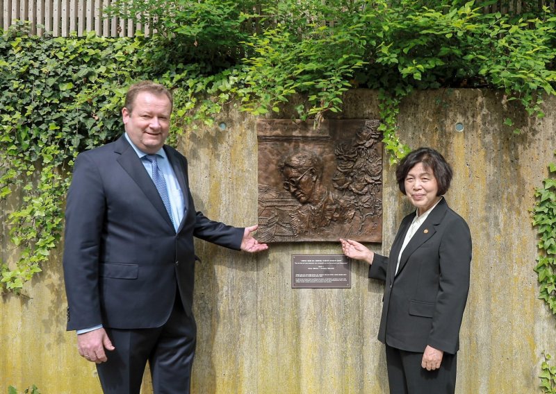 강정애 보훈부 장관과 페터 쾨슬러 그래펠핑 시장이 브래펠핑 시내에 위치한 '이의경 지사 기념시설'을 둘러보고 기념촬영을 하고 있다. 사진=국가보훈부