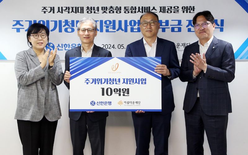 이날 서울 종로구 아름다운재단 1층 대회의실에서 열린 주거위기청년 지원사업 기부금 전달식에는 김기흥 신한은행 경영지원그룹장과 한찬희 아름다운재단 이사장 등이 참석했다. 신한은행이 이날 전달한 기부금은 총 10억원이다. 만 18~34세의 주거위기 청년들의 사회적 고립감 해소와 자립 안정망 구축을 위한 △임대보증금 △긴급임대료(월세) △환경조성비 및 공과금 등에 쓰일 예정이다. 청년들의 심리·정서적 안정을 위해 심리치료도 함께 진행할 예정이다.