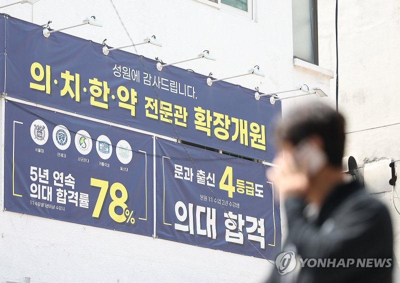 지난달 24일 서울 시내 한 학원 건물에 의대 입시 홍보물이 붙어 있다. 연합뉴스