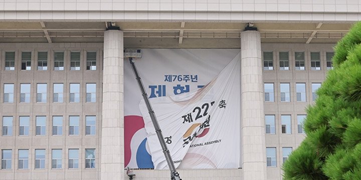 철거되는 22대 국회 개원 현수막 (서울=연합뉴스) 김주성 기자 = 서울 여의도 국회의사당 본관에 설치된 제22대 국회 개원 현수막이 7일 오후 철거되고 있다. 민생을 외면한 채 역대 최악의 국회로 불렸던 21대 국회를 능가하는 정쟁의 화약고로 자리매김할 조짐을 시작부터 보이고 있는 상황이다.