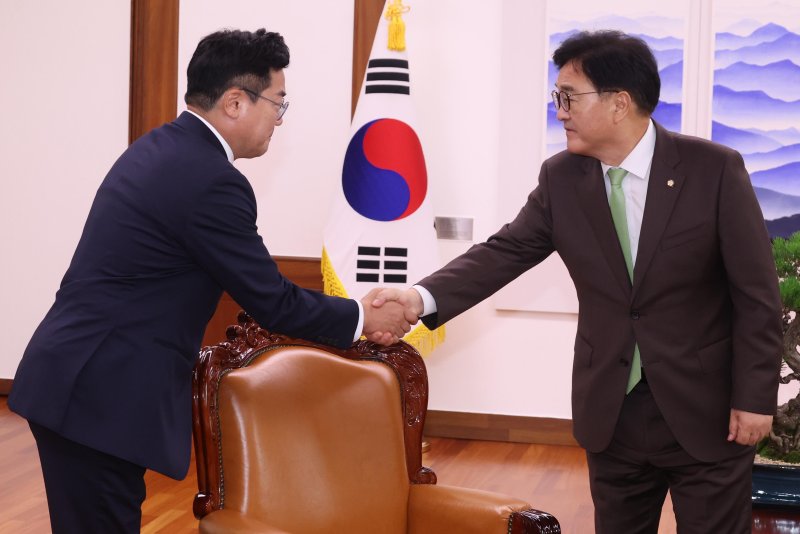 우원식 국회의장이 16일 오전 서울 여의도 국회의장 집무실에서 본회의 개최 촉구를 위해 방문한 박찬대(왼쪽) 더불어민주당 당 대표 직무대행 겸 원내대표와 악수하고 있다. 뉴시스