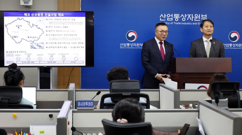 [세종=뉴시스] 강종민 기자 = 안덕근 산업통상자원부 장관과 황수호 한국수력원자력 사장이 18일 세종시 정부세종청사에서 체코 신규원전 건설사업의 우선협상대상자 선정 관련 브리핑을 하고 있다. 2024.07.18. ppkjm@newsis.com [세종=뉴시스]이승주 기자 = 대한민국 팀코리아가 원전 강국 프랑스를 제치고 체코의 신규 원전 사업을 수주하는데 성공했다. 아직 우선협상대상자인 만큼 내년 3월 계약을 유리하게 체결할 수 있도록, 협상에 총력을 다해야 할 때다.