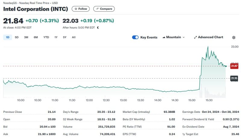 인텔 일일 주가추이 - 야후 파이낸스 갈무리