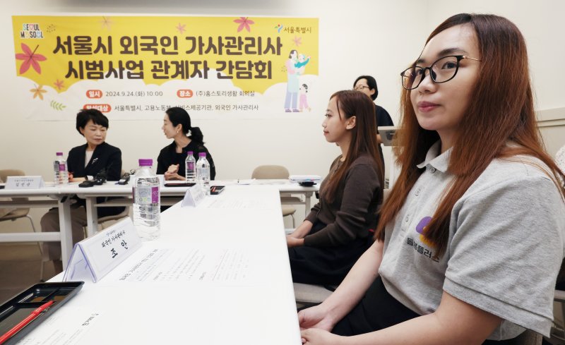 [서울=뉴시스] 김진아 기자 = 24일 서울 강남구 홈스토리생활 회의실에서 열린 서울시 외국인 가사관리사 시범사업 관계자 간담회에서 김선순 서울시 여성가족실장, 한은숙 고용노동부 외국인력담당관, 외국인 가사관리사 자스민 에리카, 조안 등 참석자들이 대화를 하고 있다. 2024.09.24. bluesoda@newsis.com [서울=뉴시스] 박대로 기자 = 외국인 가사관리사 시범사업 시작 20여일 만에 2명이 무단 이탈한 가운데 인권침해 행위가 있었다는 취지의 주장이 나왔다.