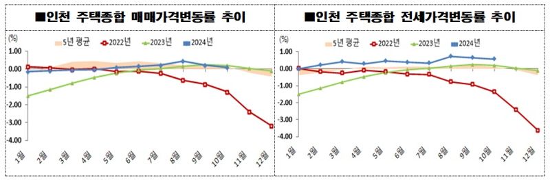 전세가격 변동률은 10월 0.58%로 9월(0.66%)보다 상승 폭이 다소 축소됐으나 여전히 수도권 평균(0.33%)을 크게 상회했다. 서구가 1.15%로 가장 높은 상승률을 보였으며 부평구(0.72%), 중구(0.71%), 남동구(0.57%), 연수구(0.27%), 계양구(0.25%) 등이 상승세를 이어갔다. 미추홀구와 동구는 각각 0.22%의 상승률을 기록했다.
