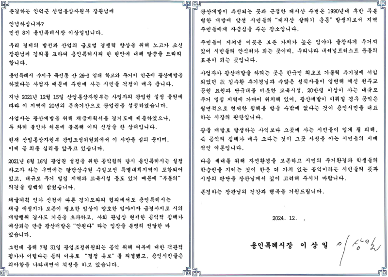 이상일 용인시장이 2일 안덕근 산업통상부 장관에게 수지구 죽전동 광산개발 허가 반대 입장을 담은 서한문을 보냈다. 용인시 제공