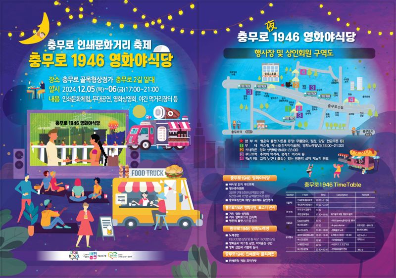 [파이낸셜뉴스] 서울 중구는 오는 5일과 6일 충무로 인쇄문화거리에서 ‘충무로 1946 영화야(夜)식당’ 축제를 개최한다고 3일 밝혔다. 축제는 이틀간 저녁 5시부터 9시까지 충무로 골목형상점가 상인회의 주관으로 진행된다.