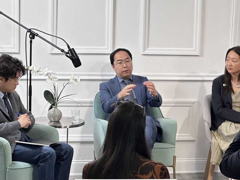지난 9월 8일 미국 뉴저지주 포트리에서 열린 한인 간담회에서 민주당의 앤디 김 당시 하원의원(가운데)이 발언하고 있다.연합뉴스