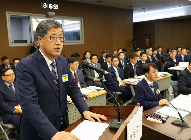 지난 10월 14일 오후 부산 국제금융센터에서 열린 정무위원회 예금보험공사, 한국자산관리공사, 한국주택금융공사, 신용보증기금에 대한 국정감사에서 최원목 신용보증기금 이사장이 업무보고를 하고 있다. 사진=연합뉴스