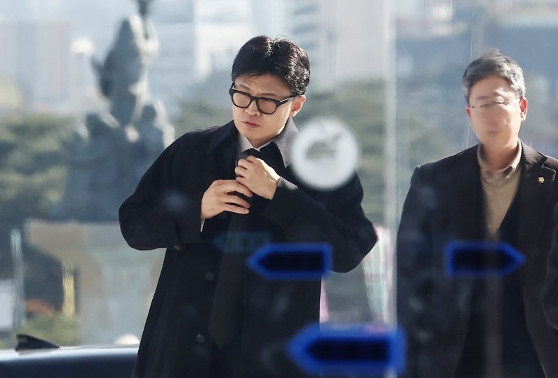한동훈 국민의힘 대표가 7일 오후 한덕수 국무총리와 긴급회동을 마치고 서울 여의도 국회에 도착해 본청으로 들어서고 있다. 뉴스1