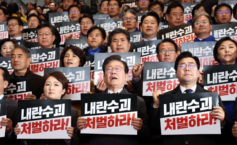 이재명 대표, 박찬대 원내대표를 비롯한 더불어민주당 의원들이 7일 서울 여의도 국회 로텐더홀 계단에서 열린 대통령 담화 규탄 의원총회에서 구호를 외치고 있다. 뉴스1