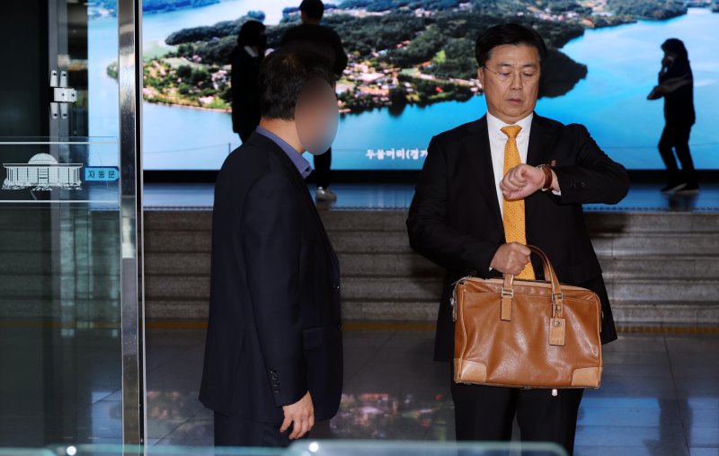 홍장원 국가정보원 1차장이 지난 6일 오후 서울 여의도 국회에서 비상계엄관련 현안보고를 마치고 밖으로 나서며 시간을 확인하고 있다. 이날 홍장원 1차장은 "체포 대상자는 우원식 국회의장, 이재명 더불어민주당 대표, 한동훈 국민의힘 대표, 박찬대 더불어민주당 원내대표, 조국 조국혁신당 대표 등"이라고 밝혔다. /사진=뉴시스화상