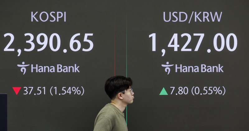 비상계엄 사태를 둘러싼 정치적 불안정에 대한 자본시장의 우려가 현실화하고 있는 9일 오전 서울 중구 하나은행 본점 딜링룸 전광판에 이날 거래를 시작한 코스피와 원·달러 환율, 코스닥 지수가 표시돼 있다. 연합뉴스.