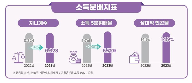 지니계수도 소폭 감소했다. 지니계수는 0에서 1 사이 값으로 나타난다. 1에 가까워질 수록 불평등도가 높아진다.2023년 가처분 소득 기준 지니계수는 0.323으로 전년 대비 0.001 줄었다.