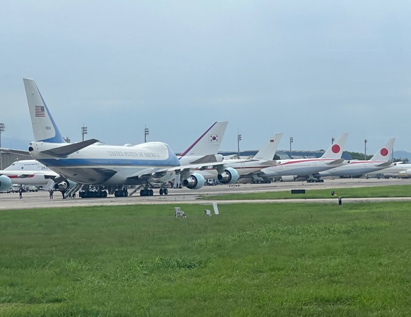 윤석열 대통령 등 각국 정상들이 G20 정상회의 일정을 마치고 귀국길에 오르는 19일(현지시각) 브라질 리우데자네이루 갈레앙 공군기지에 한국(공군1호기), 미국(에어포스원) 대통령, 일본 총리 전용기가 나란히 이륙을 위해 기다리고 있다. 사진=뉴시스
