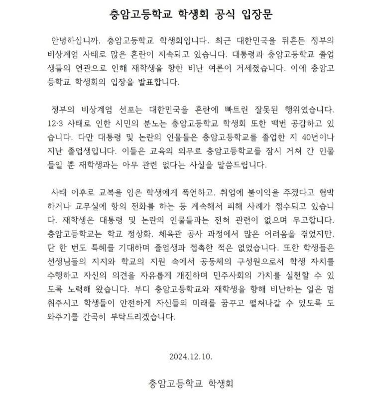 10일 충암고 학생회는 사회관계망서비스(SNS)에 공식 입장문을 내고 "12·3 사태로 인한 시민의 분노는 충암고 학생회 또한 백번 공감하고 있다"라며 "다만 대통령 및 논란의 인물들은 충암고를 졸업한 지 40년이나 지난 졸업생이다. 충암고를 잠시 거쳐 간 인물일 뿐 재학생과 아무 관련이 없다"라고 강조했다.