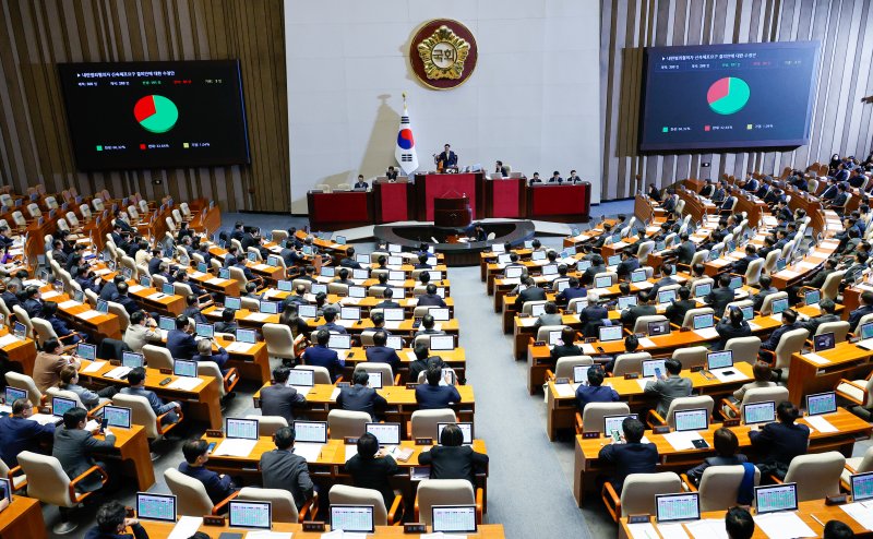 10일 오후 서울 여의도 국회 본회의장에서 열린 제418회국회(정기회) 18차 본회의에서 내란범죄혐의자 신속체포요구 결의안에 대한 수정안이 재적 300인, 재석 288인, 찬성 191인, 반대 94인, 기권 3인으로 통과되고 있다. 사진=뉴스1화상