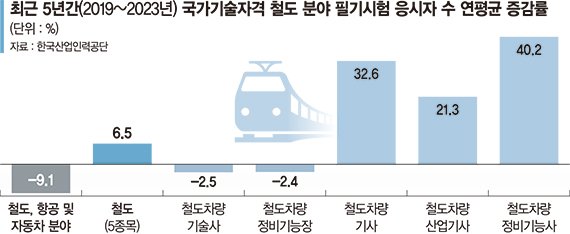 국가기술자격 중 철도 분야 필기시험 응시 인원은 연평균 6.5% 증가한 것으로 조사됐다. 이는 철도 인프라 확장과 철도 안전 및 기술 표준 강화에 따라 전문 인력에 대한 수요가 증가했기 때문으로 분석된다.