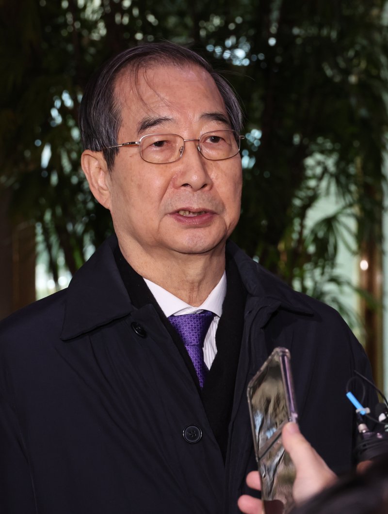 [서울=뉴시스] 김명원 기자 = 한덕수 대통령 권한대행 겸 국무총리가 15일 오전 서울 종로구 정부서울청사를 나서며 기자들의 질문에 답하고 있다. 2024.12.15. kmx1105@newsis.com /사진=뉴시스