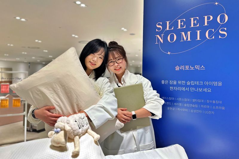 슬리포노믹스는 현대인이 숙면을 위해 많은 돈을 지출하기 시작하면서 성장하고 있는 관련 산업을 말한다. 에이스 침대, 시몬스, 장수돌침대, 슬립앤슬립, 까르마 등 약 13여개 침구 브랜드가 참여한다. 롯데백화점 구리점의 슬리포노믹스 행사장에서 모델들이 포즈를 취하고 있다. 롯데백화점 제공
