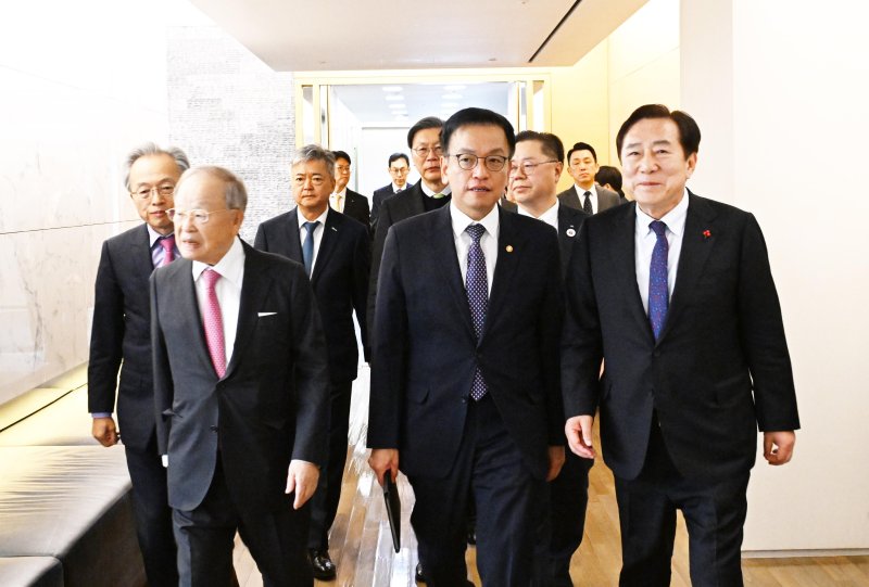 최상목 부총리 겸 기획재정부 장관과 경제6단체장이 16일 서울 중구 대한상공회의소에서 간담회를 하기 위해 이동하고 있다. (사진=기획재정부 제공)