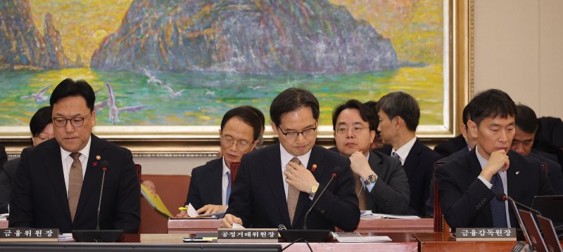 18일 서울 여의도 국회에서 열린 정무위원회 전체회의에 참석한 김병환 금융위원장, 한기정 공정거래위원장, 이복현 금융감독원장(왼쪽 첫번째부터). 연합뉴스 제공