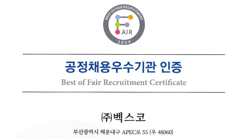 벡스코는 올해 최초로 이 인증을 신청했다. 심사 결과 ‘공정채용에 대한 기관의 의지’ 및 ‘채용 후 설문조사를 통한 지원자들의 피드백 적극 반영’ 등의 면에서 채용 과정이 우수한 기관이라는 평가를 받았다.
