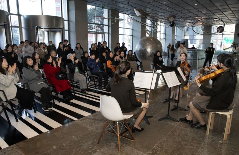 서울 정동에 위치한 예원학교 학생들이 18일 낮 광화문 흥국생명빌딩 1층 로비에서 클래식 연주회를 개최했다. 태광그룹 세화미술관이 '2024 해피뉴이어 해머링맨 프로젝트'의 일환으로 마련한 문화·예술행사의 첫번째 프로그램이다.