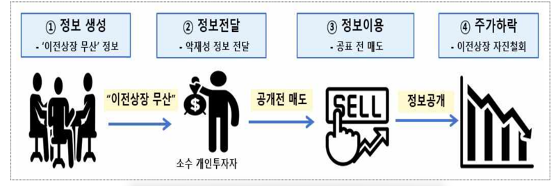 금감원에 따르면 코넥스 상장법인 임원은 코스닥으로의 이전상장 요건 충족을 위한 유상증자를 진행하는 과정에서 사실상 이전상장이 무산됐음을 인지하자, 자신과 친분이 있는 소수의 개인투자자들에게 코스닥 이전상장 무산이라는 악재성 정보를 전달했다.