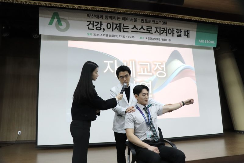이준엽 약산애 한방병원 원징이 지난 18일 국립항공박물관에서 에어서울 임직원들에게 건강에 도움이 되는 자세를 설명하고 있다. 에어서울 제공