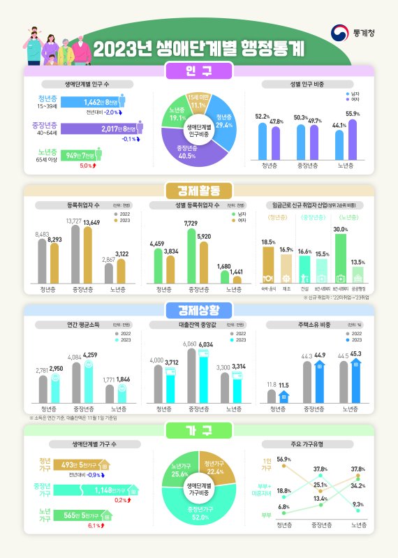 23일 통계청 ‘2023년 생애단계별 행정통계’에 따르면 청년층(15~39세)은 전체 청년 인구 중 11.5%가 주택을 소유했다. 중장년층은 44.9%, 노년층은 45.3%가 주택을 소유했다. 전년에 비해 청년층 주택소유 비중은 0.3%p 감소했다. 반면 중장년층과 노년층은 각각 0.6%p, 0.8%p 증가했다.