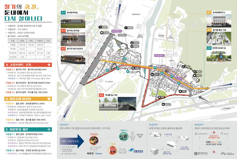 총 250억원이 투입되는 이 사업은 4년간 진행되며 철기 히스토리움, 둔내로 터미널, 둔내로 로컬하우스 등을 조성, 지역 관광을 활성화하고 인근 리조트와 KTX 둔내역의 유동인구 유입을 유도해 지역 경제를 활력 있게 만들 계획이다.