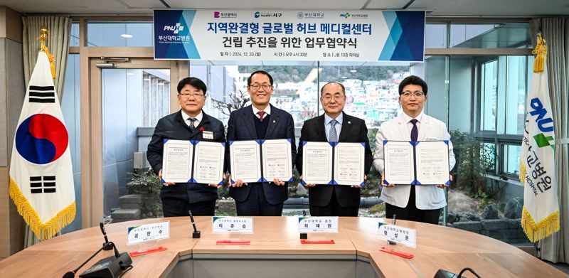 [파이낸셜뉴스] 부산시·부산 서구·부산대·부산대병원이 23일 오후 부산대병원에서 ‘지역완결형 글로벌 허브 메디컬센터 구축사업’의 성공적인 추진을 위한 업무협약(MOU)을 체결했다.