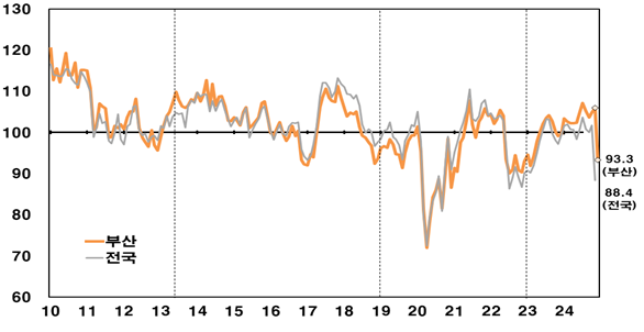 한편, 2024년 12월 중 전국의 소비자심리지수는 전월대비 12.3p 하락한 88.3으로 부산과 유사한 하락폭을 보였다.